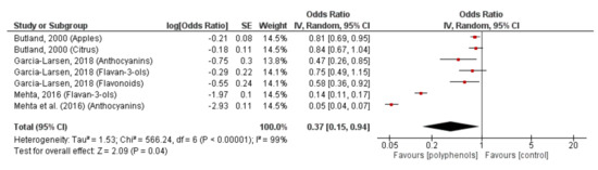 Data from three studies [21,22,25] (comprising 5950 participants) were pooled to examine the effect of polyphenol intakes on lung function in healthy adults. Because the studies included subclasses of polyphenols and fruit (apples and citrus) [25], anthocyanins [21,22], flavan-3-ols [21,22], and flavonoids [22], results from each subclass were considered as independent studies. The summarised adjusted OR shows the overall treatment effect (calculated as the weighted average of the individual ORs). The combined treatment effect of polyphenol intake on lung function is 0.37 (0.15, 0.95, 95% CI, p < 0.00001), indicating an improvement in lung function with increased intakes of polyphenols (Figure 2).
