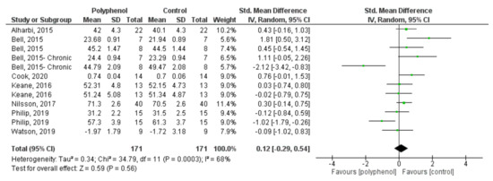 Data from six studies [29,35,38,39,45,51] (comprising 171 participants) investigating the effects of fruit-derived polyphenol supplementation on attention tasks were pooled in the meta-analysis. Studies that used two intervention periods (acute and chronic) [38], and/or more than one attention task [38,45,51] were considered s independent studies. The summarised effect of 12 ES shows a small, insignificant effect (SMD = 0.12, 95% CI −0.29, 0.54, p < 0.56) of polyphenol supplementation on attention tasks, with significant heterogeneity (Tau = 0.34, p = 0.0003) (Figure 4).