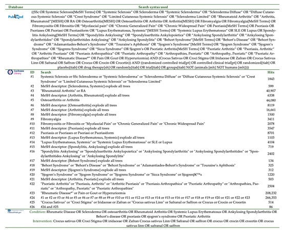 Combinations of relevant keywords were used to identify relevant RCTs in the literature. The keywords used included (Crocus sativus), (saffron), (crocin), (crocetin), (safranal), (rheumatoid arthritis), (scleroderma), (fibromyalgia), (Behçet’s syndrome), (osteoarthritis), (hyperuricemia), (gout), (ankylosing spondylitis), (psoriatic arthritis), (psoriasis), (psoriatic plaque), (spondylarthritis), (systemic lupus erythematosus), (lupus), (SLE), (Sjogren’s syndrome), (systemic sclerosis), and (rheumatic disease*).