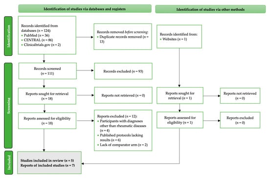 Out of 139 studies screened in total, five RCTs and seven publications (two studies with duplicate publications) [27,28,29,30,31,32,33] fulfilled the protocol’s criteria and were included in the systematic review. Figure 2 details the PRISMA 2020 flow diagram of the study selection process [19].