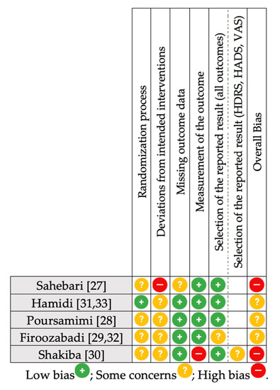 All trials were conducted in Iran and were published between the years 2018 and 2021. The RCTs employed a parallel intervention design. No cross-over trials were retrieved, fulfilling the PICO question of the study. All included RCTs were double blinded [27,28,29,30,32].