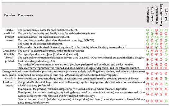 - Gagnier, J.J.; Boon, H.; Rochon, P.; Moher, D.; Barnes, J.; Bombardier, C. Reporting randomized, controlled trials of herbal interventions: An elaborated CONSORT statement. Ann. Intern. Med. 2006, 144, 364–367. [Google Scholar] [CrossRef] [PubMed]