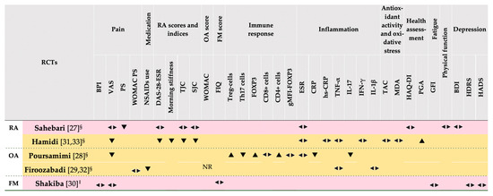 Qualitative synthesis without meta-analysis of the outcomes in each RCT, favoring the saffron arms post-intervention. All RCTs had less than 50 participants in each arm. Row background colors denote study quality according to the RoB assessment. BDI, Beck Depression Inventory [51]; BPI, Brief Pain Inventory [40]; DAS-28, disease activity score 28 [47]; ESR, erythrocyte sedimentation rate; FIQ, Fibromyalgia Impact Questionnaire [48,49]; FM, fibromyalgia; FOXP3, forkhead box protein P3; GFI, global fatigue index [44]; gMFI, geometric mean fluorescence intensity; HADS, Hospital Anxiety and Depression Scale [46]; HAQ-DI, health assessment questionnaire-disability index [42]; HDRS, Hamilton Depression Rating Scale [45]; hs-CRP, high sensitivity C-reactive protein; IFN-γ, interferon-γ; MDA, malondialdehyde; NR, not reported; NSAIDs, non-steroid anti-inflammatory drugs; OA, osteoarthritis; PGA, Physician Global Assessment [43]; RA, rheumatoid arthritis; RCT, randomized controlled trial; RoB, risk of bias [24]; SJC, swollen joint count; TAC, total antioxidant capacity; Th, T helper; TJC, tender joint count; Treg, T regulatory; ‖ intervention duration <3 months; § intervention duration between 3–4 months; ▲ increased; ▼ reduced;