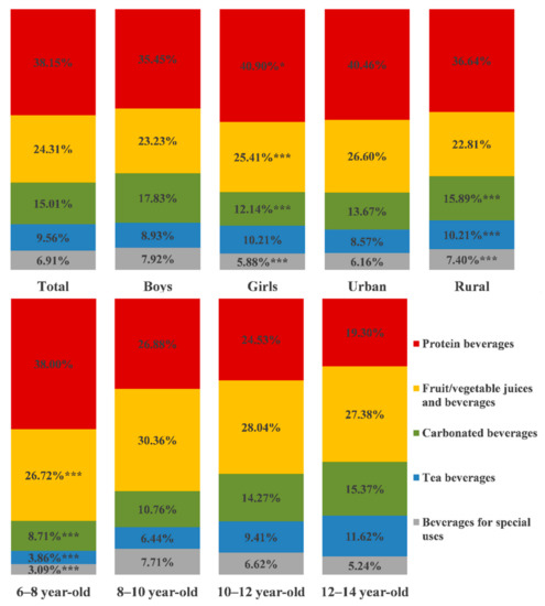As shown in Figure 1, the top three sources of sugar intake from beverages were protein beverages (38.15%), fruit/vegetable juices and beverages (24.31%) and carbonated beverages (15.01%). For gender, the proportions of girls’ sugar intake from protein and fruit/vegetable juices and beverages were significantly larger than those of boys, but the proportions of carbonated beverages and beverages for special uses were less than boys (pall < 0.05). For students who were 6–8 years old, the proportions of sugar intake from protein, carbonated, tea beverages and beverages for special uses were less than students of other ages (pall < 0.001), and the proportions of fruit/vegetable juices and beverage was only less than the proportions of those students aged 8–10. For those students aged 12–14, the proportions of sugar intake from these five kinds of beverages were larger than students who were 8–10 years old. For the rural students, the proportions of sugar intake from carbonated, tea beverages and beverages for special uses were significantly larger than urban students’ (pall < 0.001). Compared with the rural students, although the proportions of protein beverages and fruit/vegetable juices and beverages were higher among urban students, significant differences were not found.