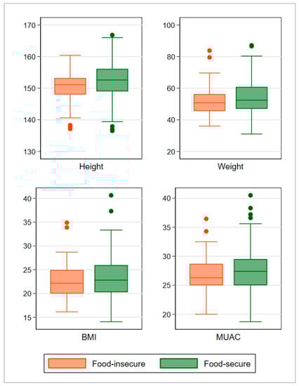 Figure 1 visualizes the distribution of height, weight, BMI, and MUAC by food-security status in the matched sample. The average height, weight, BMI, and MUAC tends to be lower among the women in the food-insecure group.