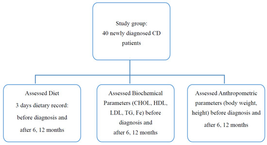 The study group consists of patients diagnosed and treated in the Department of Pediatrics, Gastroenterology, and Nutrition, University Children’s Hospital in Krakow, in the years 2019–2021. The inclusion criteria for the study were as follows: children and adolescents aged 2–18 years in whom CD was newly diagnosed on the basis of clinical symptoms, results of immunological tests, and histopathological pictures of biopsies taken from the duodenum. When recruiting patients, we used the European Society Paediatric Gastroenterology, Hepatology and Nutrition guidelines in force at the time when the study began [2]. Parents or legal guardians of the children, as well as the patients over 16 years of age, gave consent to participate in the study. The exclusion criteria were: age below 2 and above 18 years; confirmed infections or chronic diseases of the gastrointestinal tract (e.g., inflammatory bowel disease); obesity, thyroid diseases; neoplastic diseases (especially of the gastrointestinal tract); immunodeficiencies; lack of consent of the patient and/or legal guardian for participation in the study. In all patients, Immunoglobulin A (IgA) deficiency was excluded, the titer of antibodies to tissue transglutaminase in IgA class (TTG IgA) and the coeliac-related genotype HLA DQ2/DQ8 (CeliacStrip; Operon) were assessed. An enzyme-linked immunosorbent assay test (ELISA) was used to determine antibody titers, with levels above 20 RU/mL considered as abnormal. All laboratory tests were performed in a hospital laboratory in accordance with Good Laboratory Practice (GLP) rules and using tests with In Vitro Diagnostics/Food and Drug Administration (IVD/FDA) certificates intended for routine medical diagnosis and being part of the clinical protocol in specialized laboratories of the University Children’s Hospital in Krakow. All patients underwent gastroscopy with specimen collection, obtained from both the duodenum and the duodenal bulb, for histopathological evaluation. The degree of villous atrophy was determined using the Marsh–Oberhuber classification [11]. Once the diagnosis was confirmed, the patients and their parents were instructed to follow a gluten-free diet. At 3 measurement points, i.e., before diagnosis, after six months and after one year on the diet, the patients were assessed for height and weight, laboratory tests were also taken, and their diet was evaluated (Figure 1).