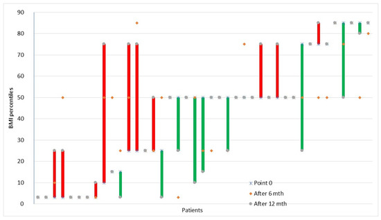 Changes in individual children’s BMI percentiles in time. The lines describe the BMI percentile change individually for each child between three time points: before diagnosis (point 0) and after 6 and 12 months. Red means increase and green means decrease.