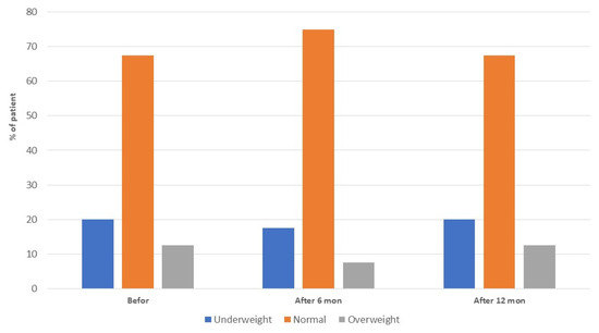 After a year of the study, the percentage distribution of children in the three groups (underweight, normal, overweight) was the same as at the beginning of the study (Figure 3). There were no obese children in the study group at any point in time.