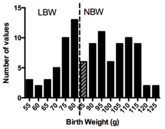 Based on these criteria, FGR pups were below 80 g and NBW pups were above 90 g, in accordance with previously reported pup weight ranges in uterine artery ligation and maternal feed restriction guinea pig models [44]. Animals between 80 g and 90 g (grey hatched bar) were excluded from analyses (Figure 1).