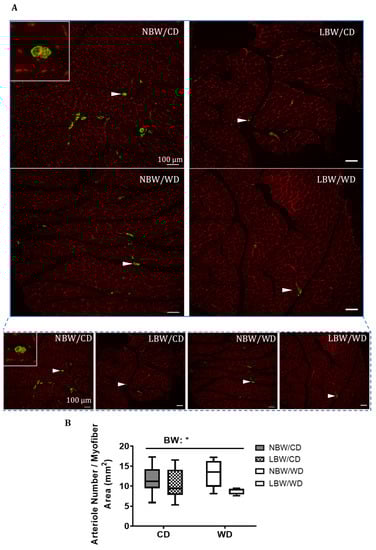 Microtome sections of smooth muscle α-actin (α-SMA) immunoreactivity of muscle arterioles. Sections were immunostained for α-SMA (white arrowhead) to identify vascular smooth muscle cells in gastrocnemius from 145-day-old NBW and LBW guinea pig offspring fed a postnatal CD or WD. (A) Representative fields at high and low magnification and (B) arteriole number/myofiber area are displayed. Data are presented as min. to max. box and whisker plots for 5–9 animals/experimental group. BW, birth weight; scale bar = 100 μm. * p < 0.05 for the main effect of birth weight (BW) using a regular two-way ANOVA.