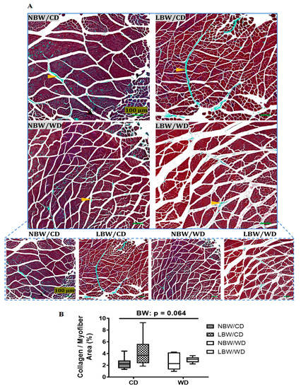 Muscle fibrosis in guinea pig offspring. Sections were stained with Masson’s trichrome to identify collagen deposition (orange arrowheads) at postnatal day 145 in guinea pig offspring fed a postnatal CD or WD. (A) Representative fields at high and low magnification and (B) percentage of collagen deposition/myofiber area are displayed. Data are presented as min. to max. box and whisker plots for 5–9 animals/experimental group. p value indicates the main effect of birth (BW) way using a regular two-way.