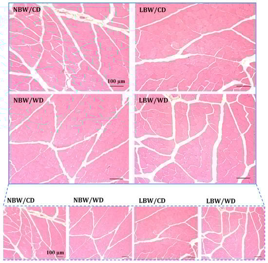 The accumulation of adipocytes within muscle is a common manifestation of muscle pathology and was investigated in hematoxylin and eosin (H&E)-stained sections of gastrocnemius from NBW and LBW offspring fed the CD or WD. Interstitial adipocytes were not observed in histological images for any treatment groups (Figure 5); therefore, fat deposition was not quantified.