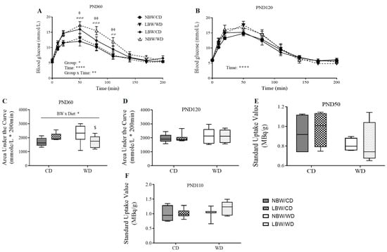 Whole-body glucose tolerance and skeletal muscle glucose uptake. Blood glucose at PND60 (A) and PND120 (B) was measured after an overnight (16 h) fast and at specific time points for 200 min following an intraperitoneal injection of 1 g/kg of 50% dextrose solution. The area under the glucose curve (AUC) as an index of whole-body glucose excursion after glucose loading at postnatal day (PND) 60 (C) and PND120 (D). Standard uptake value (SUV) = image-derived radioactivity/(injected activity/body weight) at PND50 (E) and PND110 (F) are presented. Data presented are the mean ± standard error (SEM) or min. to max. box and whisker plots for n = 4–12 animals/experimental group. Two-way repeated-measures ANOVA showed that the main effects of experimental group, time, and the time × experimental group interaction: * p < 0.05; ** p < 0.01; **** p < 0.0001. ϕ p < 0.05 and ϕϕ p < 0.01 for the difference between NBW/CD and LBW/CD offspring and ≠≠ p < 0.01; ≠≠≠ p < 0.001 for the difference between NBW/CD and NBW/WD offspring following a Bonferroni post hoc test. BW × Diet: * for p < 0.05 for the main effect of birth weight (BW) and diet interaction using a regular two-way ANOVA. $ p < 0.05 for the difference between NBW/WD and LBW/WD after a Bonferroni post hoc test following a regular two-way ANOVA.