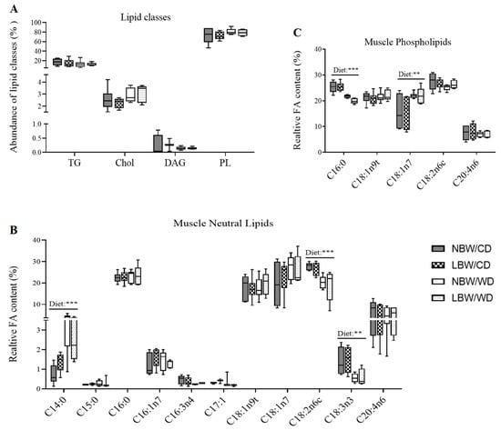 Relative abundance of lipid species and fatty acid profiles at postnatal day 145. (A) Relative abundance of lipid species, including triglycerides (TG), cholesterol (Chol), diacylglycerols (DAG), and phospholipids (PL), are displayed. Fatty acids in neutral lipid (B) and phospholipids (C) fractions are displayed. Data are min. to max. box and whisker plots for 4 to 6 animals/experimental group. **, and *** indicate p < 0.05, p < 0.01, and 0.0001, respectively, for the main effect of diet using a regular two-way ANOVA.