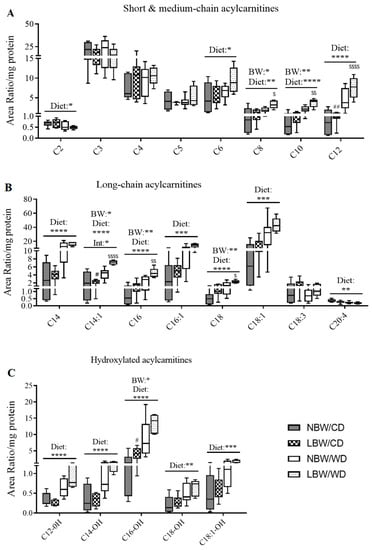 Acylcarnitine contents in offspring’s muscle at postnatal day 145. Short-, medium- (A), long- (B) chain and hydroxylated (C) acylcarnitines are presented. Data are min. to max. box and whisker plots for 5 to 8 animals/experimental group. *, **, ***, and **** for p < 0.05, p < 0.01, p < 0.001, and p < 0.0001, respectively, represent the main effect of birth weight (BW), diet (Diet), or their interaction (BW × Diet) using a regular two-way ANOVA. # and ## indicate p < 0.05 and 0.01, respectively, when comparing NBW/CD versus LBW/CD using a Bonferroni post hoc test. $, $$, and $$$$ denote p < 0.05, 0.01, and 0.000, respectively, for NBW/WD versus LBW/WD by Bonferroni post hoc test.