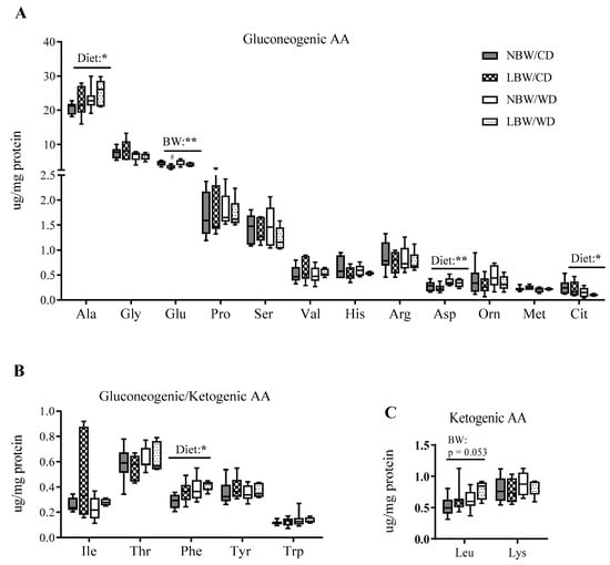 Amino acid (AA) concentrations in offspring’s muscle at postnatal day 145. Gluconeogenic (A), gluconeogenic/ketogenic (B), and ketogenic (C) AA concentrations are presented. Data are min. to max. box and whisker plots for 5 to 8 animals/experimental group. * and ** for p < 0.05 and p < 0.01, respectively, represent the main effect of birth weight (BW) or diet (Diet) using a regular two-way ANOVA. # indicates p < 0.05 and 0.01 when comparing NBW/CD versus LBW/CD using a Bonferroni post hoc test.