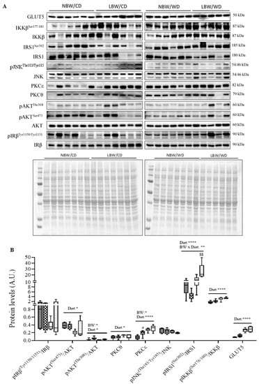 The phosphorylation of the β-subunit of the insulin receptor (IRβ) is required for its activation and propagation of downstream signaling events. Phosphorylation of IRβTyr1150/1151 was not altered by birth weight or diet (Figure 10). Protein kinase B (Akt) is phosphorylated by phosphoinositide 3 (PI3)-kinase at two sites, Ser473 and Thr308, which are both required for full activation of this protein. At the Ser473 and Thr308 sites, phosphorylation was reduced in WD-fed offspring, irrespective of birth weight (p < 0.05 Figure 10). Additionally, as a birth weight effect, phosphorylation at the Thr308 point was increased (p < 0.05). Stress-induced kinases, including c-Jun N-terminal kinases (JNK), protein kinase C (PKC)θ, and PKCε, are known to be activated in situations of oxidative stress or lipid accumulation and insulin resistance. In our study, total protein level of PKCε was increased as a main effect of birth weight, with LBW/CD displaying more PKCε level than NBW/CD (p < 0.05, Figure 10). Total protein levels of PKCθ and PKCε were also significantly higher in WD-fed animals (p < 0.05, Figure 10). JNK1-mediated disruption of insulin receptor/insulin receptor substrate 1 (IRS1) interaction and the resulting insulin resistance are dependent on IRS1 phosphorylation at both Ser302 and Ser307. IRS1 is also phosphorylated at Ser307 by IKKβ kinase. In the current study, while activation of JNK through phosphorylation at Thr183/Tyr185 was not altered by birth weight nor diet, phosphorylation of IRS1 at Ser302 increased in WD-fed offspring (p < 0.0001, Figure 10). Interestingly, IRS1 phosphorylation at Ser302 was exacerbated in LBW/WD compared to NBW/WD (p < 0.001, Figure 10). The activation of IKKβ through phosphorylation at Ser177/181 was also increased in WD-fed offspring (p < 0.0001, Figure 10). The first step by which insulin increases energy storage or utilization in muscle involves the regulated transport of glucose into cells, mediated by the facilitative glucose transporter 4 (GLUT4). While GLUT4 protein was not measured, total GLUT5, was significantly (p < 0.0001) increased as a WD main effect (Figure 10).