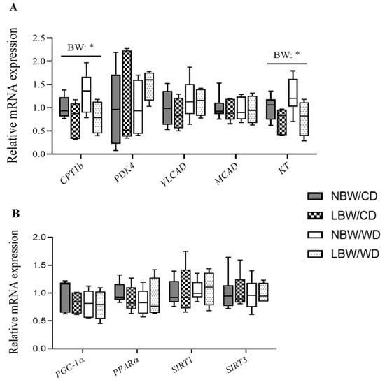 A Shapiro–Wilks test was used to determine if data were normally distributed, then data were Box−Cox transformed if necessary, prior to ANOVA. Two-way ANOVA was employed to assess the main effect and the interaction effect of birth weight and postnatal diet (GraphPad Software, San Diego, CA). A Bonferroni post hoc test was used to compare NBW/CD versus LBW/CD, as well as NBW/WD versus LBW/WD. When comparing only NBW and LBW at birth and during lactation period, two-tailed unpaired Student’s t-test was used.