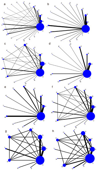 Networks of treatment comparisons. A, S. boulardii; B, LGG; C: L. reuteri; D, Bacillus clausii; E, L. acidophilus; F, B. lactis; G, L. sporogenes; H, L. plantarum; I, ECN 1917; J, L. paracasei; K, E. faecium; L, L. spp.; M, L. spp. + B. spp.; N, L. spp. + B. spp.+ S. spp.; O, L. spp. + S. spp.; P, B. spp. + S. spp.; Q, Bacillus spp. + E. spp. + C. spp.; R, L. spp. + B. spp. + E. spp.; S, L. spp. + B. spp. + P. spp.; T, L. spp. + S. spp. + C. spp. + Bacillus spp.; U, control (placebo/no treatment). (a) network of the duration of diarrhea (control = placebo/no treatment); (b) network of the duration of diarrhea (control = placebo); (c) network of the duration of diarrhea (control = no treatment); (d) network for diarrhea lasting ≥ 2 days; (e) network of the duration of hospitalization; (f) network of the mean stool frequency on day 2; (g) network for the duration of vomiting; (h) network of the duration of fever. The circle size indicates the number of patients, and the line thickness indicates the number of trials.