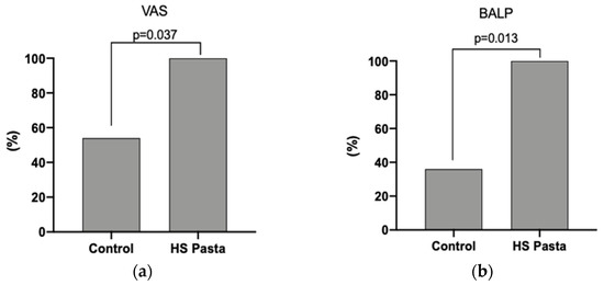 Changes in the clinical parameters after each treatment period are shown in Table 2. After 6 weeks, the consumption of HS pasta resulted in a greater VAS change compared to the regular pasta control group (−2.9 ± 1.3 cm and−1.3 ± 1.3 cm, p = 0.028, respectively, Table 2). Furthermore, all subjects who consumed the HS pasta had a significant reduction in VAS value in comparison with 54% of the control group (p = 0.037; Figure 1a). A significant reduction of serum BALP concentration was also detected in the participants consuming the HS pasta compared to individuals consuming their regular pasta (p = 0.041; Table 2). In particular, BALP change was −2.8 ± 3.2 µg/L and 1.1 ± 4.3 µg/L in the HS pasta and in the regular pasta control group, respectively (Table 2). Moreover, we found that 100% of patients who ate HS pasta had a reduction in serum BALP concentration compared to 36% of patients in the regular pasta control group (p = 0.013, Figure 1b).