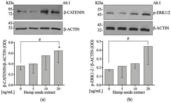 Hemp seed extract increases β-catenin and p-ERK1/2 pathways protein levels on Saos-2 cells. (a) Semi-confluent cultures of human osteoblast-like cells (Saos-2) incubated with HSE 5, 10, or 20 µg/mL for 24 hours. Cell proteins were analyzed by Western blotting with antibodies specific to β-catenin and β-actin. (b) Semi-confluent cultures of human osteoblast-like cells (Saos-2) were incubated with HSE 5, 10, or 20 µg/mL for 10 min. Cell proteins were analyzed by Western blotting with antibodies specific to phosphorylated ERK1/2 and β-actin. Data are represented as mean ± SD. Statistical analysis: Student’s t-test vs. 0 * p < 0.05, Linear regression # p < 0.05.