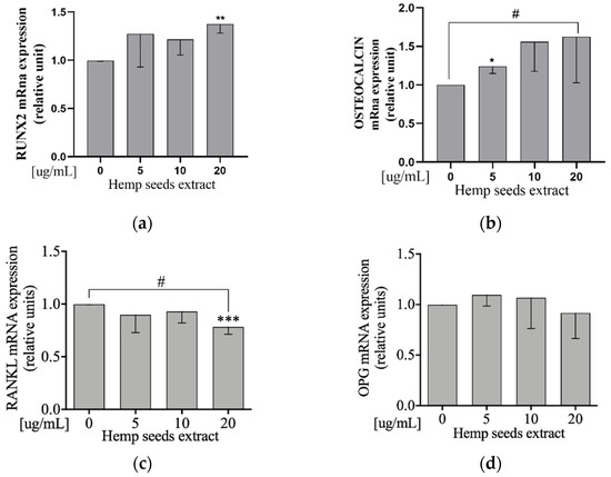 Saos2 cells were exposed to HSE at 5, 10, or 20 µg/mL doses. Only the 20-µg/mL dose decreased RANKL and increased RUNX2 mRna levels, compared to the control (Student’s t-test: p = 0.0008 and p = 0.002, respectively) (Figure 4a,c). Furthermore, we did observe a decreased RANKL and increased Osteocalcin mRNA expression level in a dose-dependent manner in comparison to the control (Linear Regression: p = 0.023 and p = 0.044, respectively; Figure 4b,c). HSE did not affect OPG mRNA expression (Figure 4d).