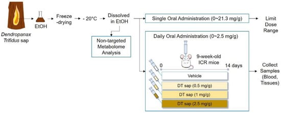 Experimental design. Experimental procedures are briefly described in the scheme. Dendropanax Trifidus sap was extracted in 100% EtOH, freeze-dried and maintained at −20 °C. Its EtOH-dissolved solution was subjected to in vivo mouse studies. A single oral administration was conducted to limit the dose range of DT sap (Figure S1). Based on this information, daily oral gavage of three concentrations was performed for 14 days. Survival rate and body weights were measured at day 0, 1, 3, 7 and 14 (Figure 2). Organ weight measurement (Figure 3), blood chemistry (Figure 4), histochemistry (Figure 5) and Western blot analysis (Figure 6) were performed on the samples of day 14. In order to analyze the chemical components of DT sap, it was subjected to non-targeted metabolome analysis (Figure 7, Table 1).