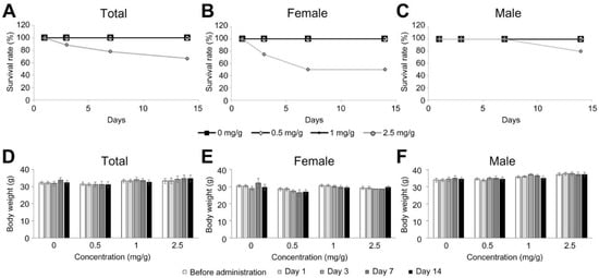 Therefore, for the multiple administration regime, the highest concentration used among the tested concentrations was set lower than 4.8 mg/g (i.e., 2.5 mg/g). The indicated concentrations (0, 0.5, 1 and 2.5 mg/g) were applied every day by oral gavage for 14 days (Figure 2, N = 4 females and 5 males/concentration). At day 14 (i.e., end of the experimental period), the survival ratio was 100% for all the concentrations except the highest concentration (50% for female and 75% male at 2.5 mg/g, Figure 2A–C). There were no significant changes in mouse body weight by concentration and time (Figure 2D–F).