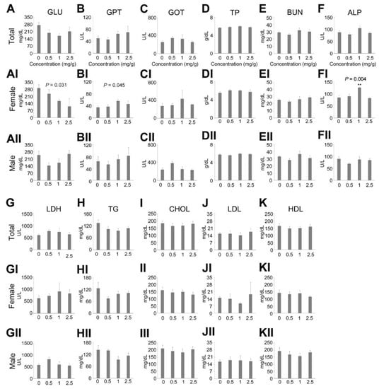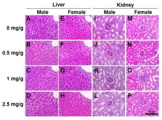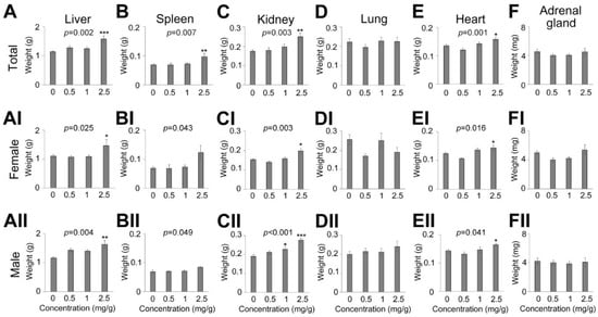 Analyzing by gender, the weights of female liver (one way ANOVA, p = 0.025, Figure 3AI), spleen (one way ANOVA, p = 0.043, Figure 3BI), kidney (one way ANOVA, p = 0.003, Figure 3CI), heart (Kruskal–Wallis one way ANOVA on Ranks, p = 0.016, Figure 3EI) were significantly changed and post hoc analysis revealed that these were due to the highest concentration of 2.5 mg/g (Holm–Sidak method, p = 0.039 for liver, p = 0.058 for spleen, p = 0.012 for kidney; Dunn’s Method, p = 0.035 for heart). There were no significant weight differences in the other concentrations. In female lung and adrenal glands, no significant weight differences were found in all the concentrations.
