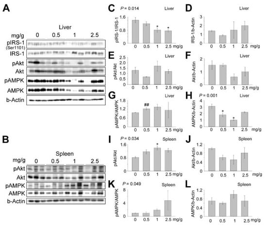 While a significant dose-dependent reduction in blood glucose was observed in female mice, it was not observed in male mice (Figure 4AI,AII). However, 0.5 mg/g DT sap administration also reduced the mean value of blood glucose in males compared to the control, although it was not statistically significant, implying a possible gender difference in dose-response. Therefore, we cannot exclude the possibility of hypoglycemic effects of DT sap on male mice as well, warranting further studies. Reduction in blood GLU with corresponding increases of DT sap concentration (Figure 4AI) may be related with the activation of the insulin signaling pathway [] or AMPK signaling pathway []. Here, phosphorylation of IRS-1 and Akt for the insulin signaling pathway and phosphorylation of AMPK for the AMPK signaling pathway were investigated. Phosphorylation of IRS-1 (Ser1101) inhibits insulin signaling [], therefore the reduction of pIRS-1(Ser1101)/IRS-1 by DT sap should result in a corresponding decrease in blood GLU, which is observed here (Figure 6C). The level of pAkt/Akt, a downstream signaling factor of IRS-1, appears to increase according to DT sap concentration (Figure 6I). These results suggest that DT sap appears to affect blood GLU regulation via activation of the insulin signaling pathway. Previous findings showed that the activation of AMPK suppresses gluconeogenesis []. In our study, pAMPK/AMPK levels were significantly increased at low DT sap concentrations (0.5 mg/g) in liver tissues (Figure 6G), and exhibited a significant increase in conjunction with increasing DT sap concentration in spleen tissues (Figure 6K). Therefore, reduced GLU production may also contribute to blood GLU reduction (Figure 4AI).