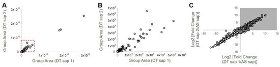 Dendropanax trifidus (DT) sap–derived chemicals identified by LC–MS/MS. Dots indicate 1080 chemicals identified by LC-MS/MS. Among them, 1041 chemicals were matched in more than one of seven annotation sources. Two batches of DT sap (indicated as DT sap 1, DT sap 2) and Acer saccharum (AS) sap were used. (A,B) Group area, which indicates area under curve of the intensity peak, of DT sap 1 and 2 are plotted. The plot region within the red dotted box is enlarged in (B). (C) The intensity of each chemical was compared between DT sap and AS sap to provide a fold change of DT sap/AS sap. X and Y axis indicate Log2 [fold change (DT sap 2/AS sap)] and Log2 [fold change (DT sap 1/AS sap)]. Chemical intensity is higher in DT sap than in AS sap in the shaded field (354 chemicals) and vice versa in the bright field (726 chemicals) in the graph. Representative chemicals in the shaded field, with high group area, are listed in Table 1.