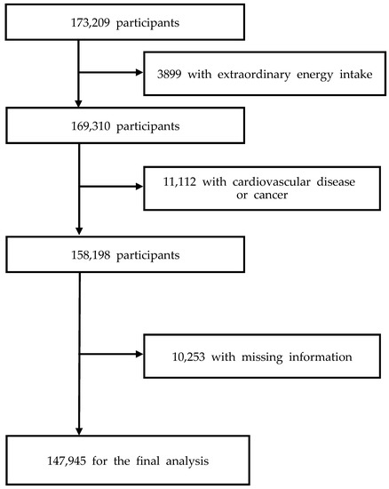 The Korean Genome and Epidemiology Study_Health Examinees (KoGES_HEXA) is an ongoing population-based cohort study that investigates genetic and environmental factors related to chronic diseases in Koreans [17]. The current study analyzed the baseline data from KoGES_HEXA, which included 173,209 community-dwellers aged 40–79 years. The participants were enrolled from eight provinces in 2004–2013, and the follow-up has not been completed yet. The Institutional Review Boards at the Korea Disease Control and Prevention Agency and Kyung Hee University (KHGIRB-19-398) provided clearance for the study protocol. All the participants signed a written informed consent. Of the total, participants who had extraordinarily low or high energy consumption (<500 kcal/d or >5000 kcal/d) (n = 3899), CVD or cancer (n = 11,112), and missing information on covariates (n = 10,253) were excluded. Our final analytic sample size was 147,945 (85.41% of the total population) (Figure 1).