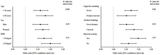 The positive associations between uPDI and dyslipidemia were consistently shown in all strata defined by age, sex, BMI, PYC, alcohol drinking, and physical activity (Figure 2). The association was significantly stronger among individuals aged ≥55 years (OR = 1.16, 95% CI [1.09, 1.22] compared to those aged <55 years (OR = 1.12, 95% CI [1.07, 1.18]) (p-value for interaction = 0.001). There was no statistically significant interaction by sex, BMI, PYC, alcohol drinking, and physical activity.