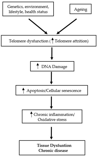 Telomeres, the specific deoxyribonucleic acid (DNA) protein structures, are the cap at both ends of each chromosome. Telomeres play an essential role in protecting the genome against nucleolytic destruction, recombination, repair, and interchromosomal fusion [1]. Each DNA replication causes telomere shortening and at the point when telomeres reach a critical limit, the cell undergoes senescence and/or apoptosis [2]. The enzyme telomerase plays a key role in the maintenance of telomere length [3]. Age is a well-established factor associated with telomere shortening [3,4]. In humans, telomere length decreases at a rate of 24.8–27.7 base pairs per year [2]. While telomere attrition with age is linked to a variety of age-related diseases and their complications, telomere attrition with ageing has been documented in multiple investigations regardless of the existence of any age-related disorders [3]. These observations support the view that shortened telomeres may serve as a potential candidate biomarker of ageing [3]. Telomere length is also affected by a combination of factors, including sex, genetics and lifestyle [2]. On the other hand, it is purported that the cellular and tissue defects associated with telomere dysfunction are mediated in part by oxidative stress and chronic inflammation mechanisms [5]. Accelerated telomere shortening is associated with mortality and many age-associated diseases, such as cardiovascular diseases, type 2 diabetes mellitus (T2DM), Alzheimer’s disease [1], as well as immune and infectious diseases [6] (Figure 1).