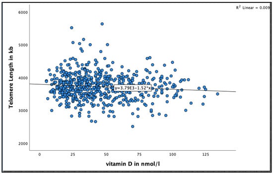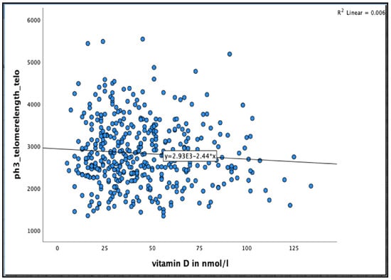 Telomeres, the specific DNA protein structures, are found at both ends of each chromosome. Their function is to protect the genome from nucleolytic degradation, unnecessary recombination, repair, and interchromosomal fusion [1]. Each DNA replication causes telomere shortening, and when the telomere length reaches a critical limit, the cell undergoes senescence and/or apoptosis [2]. The rate attrition differs between individuals and tissues, and is influenced by multiple factors. Inflammation and oxidative stress are the key determinants of telomere length, and even though some of the factors that heighten oxidative stress and inflammation are genetic, others are environmental in nature, such as smoking, alcohol consumption, obesity and a sedentary lifestyle. Moreover, several dietary factors, such as high energy consumption and the intake of high sugar foods, are also highly associated with inflammation [4,26]. While these lifestyle habits may be difficult to change, vitamin D concentration was easily modifiable through nutritional supplementation or sunlight exposure. Taking all of this into account, we sought to explore and study the association between 25(OH)D concentration and telomere length.