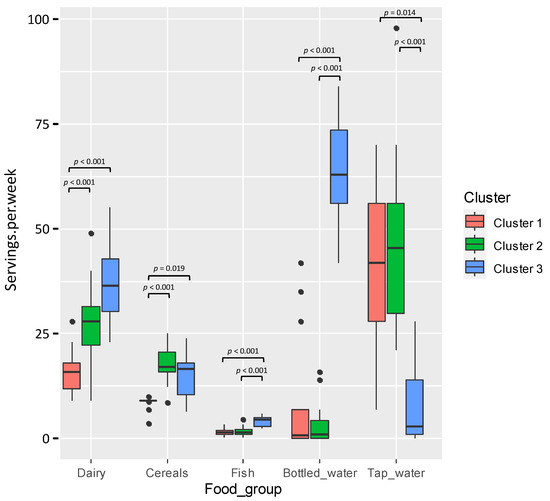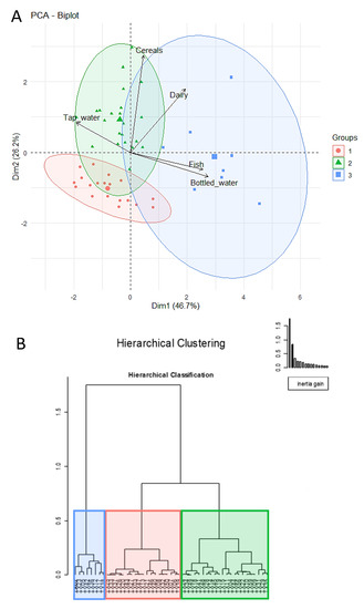 The hierarchical clustering according to the dietary habits grouped women in three groups (nesting distance of 0.85), as represented in the biplot (Figure 1A,B). The differences in the dietary habits of the participants are illustrated in Figure 2. The diets of women grouped in the cluster 1 were characterized by a limited consumption of fish, dairy products and cereals, while the women in cluster 2 had higher consumption of cereals and tap water, and a very low intake of bottled water. The diets of women grouped in cluster 3 were distinguished by high consumption of fish, dairy products and bottled water, but a scarce intake of tap water. No differences in age and lactation period were observed between the groups based on dietary habits (Bonferroni-adjusted Kruskal-Wallis tests; p > 0.308). However, differences in BMI were observed between women grouped in cluster 2 (median (IQR) = 22.18 kg/m2 (20.60–24.48 kg/m2) and cluster 3 (median (IQR) = 26.67 kg/m2 (25.99–31.83 kg/m2) (Bonferroni adjusted Kruskal-Wallis test; p = 0.018).