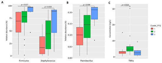 Box-plots showing the relative abundances of Firmicutes, Staphylococcus and Paenibacillus (A,B) and the concentration of TNFα (C) according to the dietary habits of women participating in the study. In the box-plots, the box represents the values of the interquartile ranges, and the median is represented as a line in the box. Outliers are represented as dots. Cluster 1 (n = 19) is coloured in red, Cluster 2 (n = 22) in green and Cluster 3 (n = 8) in blue.