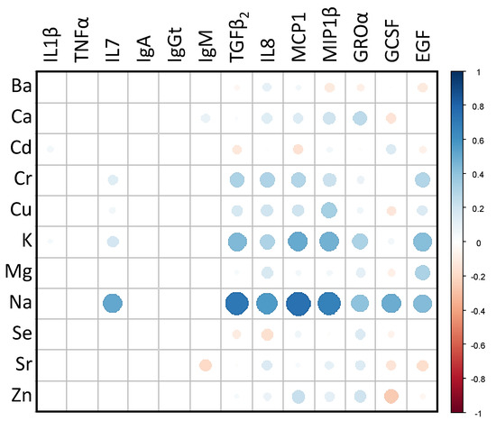 Spearman’s rank correlation matrix between the main and trace elements concentrations and the content of immunological compounds in milk samples. Blue colours show positive correlations, while reddish hues show negative correlations; dots with larger diameters show stronger correlations. The colour intensity of the dots shows the nature of the correlation: dark blue indicates a perfect positive correlation (ρ = 1) and dark red indicates a perfect negative correlation (ρ = −1).