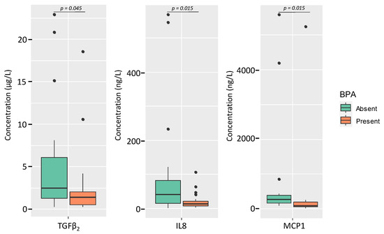 There were no associations of the microbial counts and the relative abundances of bacterial phyla and species and the content of free and total BPA and TBBPA in milk (results not shown). However, regarding the immunological profile, differences were found in the levels of TGFβ2, IL8 and MCP1 in milk depending on the presence of BPA (Figure 5 and Supplementary Table S10). The median (IQR) concentrations of TGFβ2, IL8 and MCP1 were double or higher in samples where total BPA was not detected (2.48 µg/L (1.25–6.06 µg/L), 40.75 ng/L (15.20–82.97 ng/L), and 274.36 ng/L (165.18–400.04 ng/L), respectively) than in the group of samples where BPA was detected (1.41 µg/L [(0.51–2.05 µg/L), 13.70 ng/L (7.92–21.18 ng/L) and 94.65 ng/L (68.98–201.19 ng/L), respectively) (Kruskal-Wallis tests, p = 0.045, p = 0.015, and p = 0.015, respectively) (Figure 5 and Supplementary Table S10).