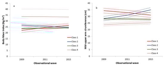 The BMI and MUAC trajectories modeled by GMM. (a) The plots for classifications of BMI trajectories by GMM. (b) The plots for classifications of MUAC trajectories by GMM. Abbreviations: BMI, body mass index; MUAC, mid-upper arm circumference; GMM, growth mixture model.