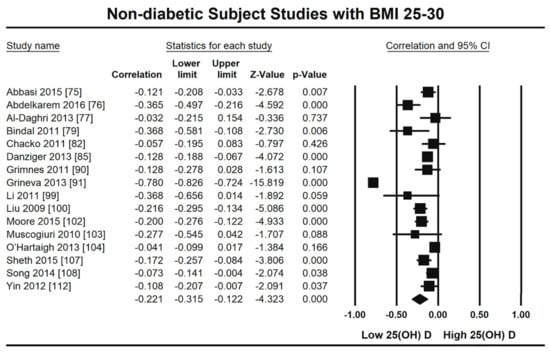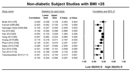 - Sorkin, J.D.; Vasaitis, T.S.; Streeten, E.; Ryan, A.S.; Goldberg, A.P. Evidence for threshold effects of 25-hydroxyvitamin D on glucose tolerance and insulin resistance in black and white obese postmenopausal women. J. Nutr. 2014, 144, 734–742. [Google Scholar] [CrossRef]