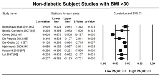 - Rafiq, S.; Jeppesen, P.B. Body mass index, vitamin D, and type 2 diabetes: A systematic review and meta-analysis. Nutrients 2018, 10, 1182. [Google Scholar] [CrossRef] [PubMed]