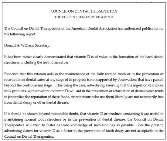 The 1945 ADA announcement that claims for vitamin D as a factor in the prevention of tooth decay are not acceptable. The second paragraph of this announcement focuses on arguments that the reputation of milk as a good source of minerals (with or without vitamin D) would be ruined if advertisers can claim that milk prevents dental caries (because people still would get cavities even though they were drinking milk). This reference to milk was another puzzling element in the ADA reversal. The ADA CDT did not endorse foods; this was within the purview of the AMA Council on Foods and Nutrition. The Journal of the American Dental Association had published in 1943 over a dozen advertisements in support of dairy products, including 2 advertisements for vitamin D milk [,]. Furthermore, the fact that people consuming adequate amount of vitamin D are not necessarily free from dental caries was well accepted. The “New and nonofficial remedies” publication of the AMA and “Accepted Dental Remedies” of the ADA had specified in 1936 and 1941, respectively, that there is no warrant for the claim that an adequate vitamin D intake will prevent dental caries [,]. This announcement can only be fully understood with the help of the ADA internal records. This ADA announcement was a reaction to the AMA vitamin D advertisement show in Figure 2.