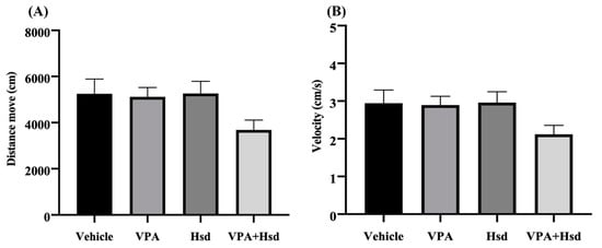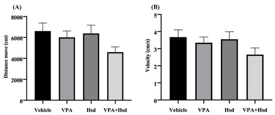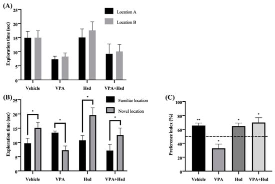 3.1. Effects of Valproic Acid (VPA) and Hesperidin (Hsd) on Memory Evaluated by Novel Object Location (NOL) Test