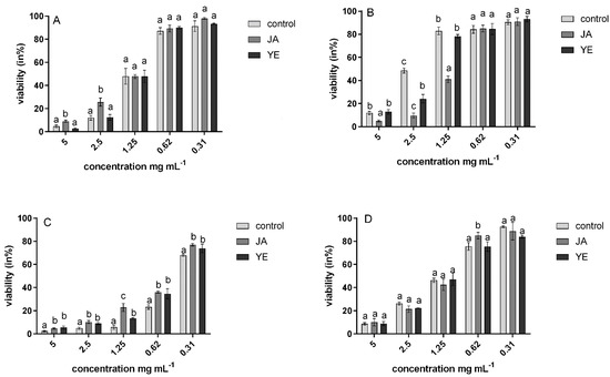 Viability (in %) of yeast C. albicans ATCC 90028 against natural (A), convention (B), microwave (C), and freeze-drying samples (D).