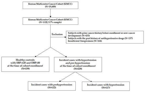 Subjects were selected from the KMCC in this population-based nested case–control study. Among 1122 subjects, we excluded those with prior cancer history before enrollment or new cancer development (n = 433), those with a history of anti-hypertensive drugs (n = 137), and those with insufficient plasma (<200 μL) (n = 164). Finally, a total 229 hypertension (Incident cases with hypertension and pre-hypertension) and 159 healthy control groups were selected (Figure 1). All participants provided written informed consent to participate, and the study protocols were approved by the institutional review board (IRB) of Seoul National University Hospital (IRB No: 0110-084-002).