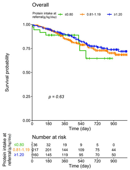 The lack of influence of a spontaneously lower protein intake is also confirmed by Cox analysis (Table 4 and Table 5, with protein intake dichotomized at ≥0.8 g/kg/day, and Supplementary Tables S8 and S9, with protein intake dichotomized at ≥1 g/kg/day).