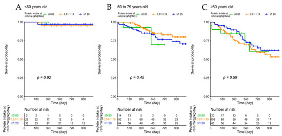 The descriptive analysis was undertaken by decades of age at referral, while the smaller cohorts of patients aged less than 60 were merged. Survival analysis was performed by larger age groups (<60; 60–79; and ≥80 years) to allow having a sufficient numerosity for further stratification for potentially relevant variables, including level of protein intake at referral.