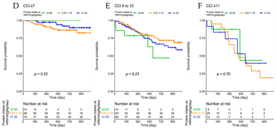 Patient survival according to protein intake at baseline, across age groups (A–C) and Charlson Comorbidity Index (D–F).