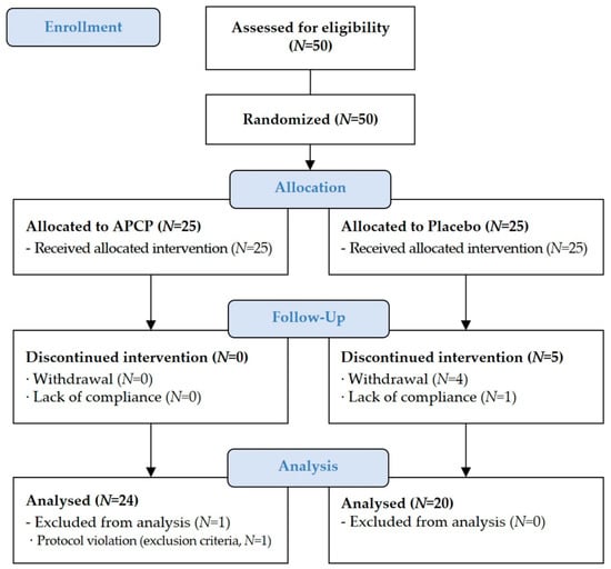 The study participants (N = 50) were randomized at baseline and allocated to the APCP group (N = 25; 1000 mg APCP) or placebo group (N = 25). In total, 44 participants completed the trial (Figure 1). Of the six participants who were excluded from the final analysis, one participant was excluded owing to abnormal fasting blood sugar level at the end visit, and five participants dropped out. There were no differences between the APCP and placebo groups in terms of sex, age, body mass index (BMI), and parameter-related skin condition (Table 1). During the study period, no side effects or adverse events were observed.